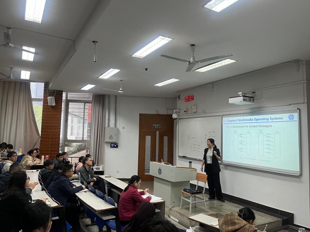 宋虹老师从多媒体文件的特征及应用出发,对多媒体操作系统管理中的核心挑战:“如何有效传递和高效存放多媒体文件,以满足不同用户的QoS需求”进行了深入剖析。她以智慧广电和“东数西算”工程为例,阐释技术布局背后的国家战略意义,启发学生思考社会责任与长远价值,为在场学生、观摩同行及教学督导呈现了一场专业知识与思政育人深度融合的精彩课堂。她强调,作为国家未来的创造者,要具备参与设计、优化整体布局的宏观视野与使命担当,将所学投入到解决社会需求的实践中去。