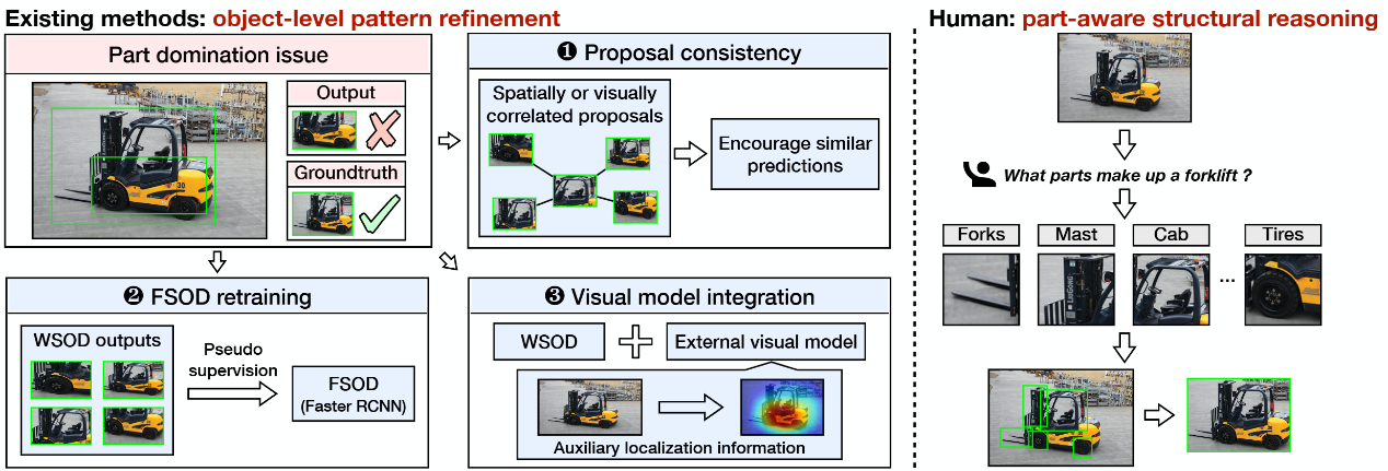 该研究借鉴“部件-整体”的人类认知机制,为解决弱监督检测中的歧义问题提供了新思路,也表明结合大语言模型与视觉模型有助于提升复杂开放环境下的目标理解能力。