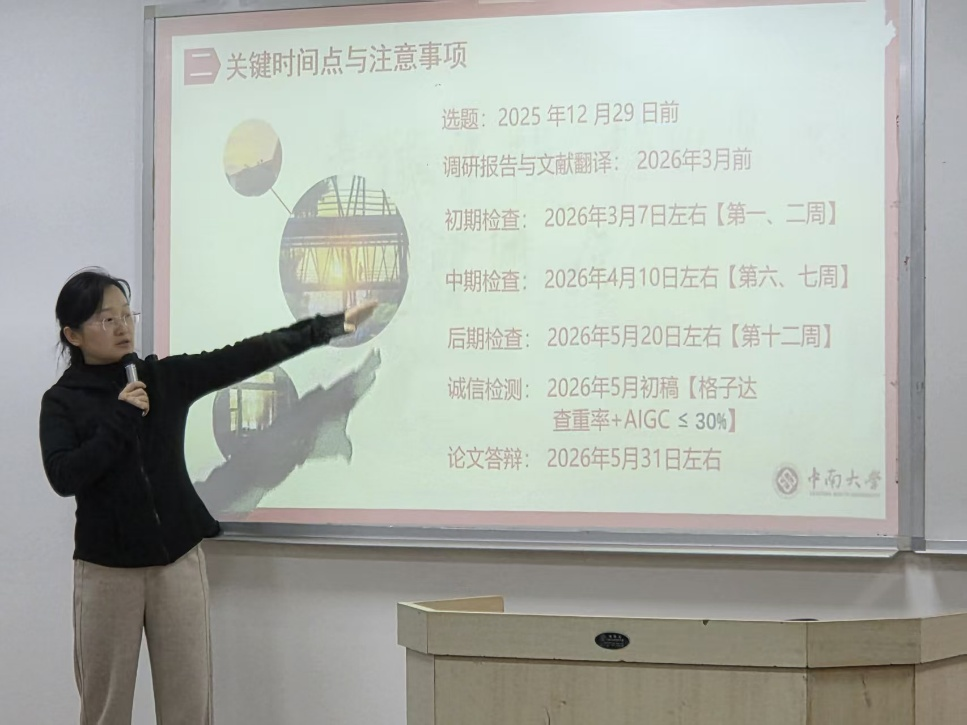 启动会上,计算机系副主任钟萍老师就毕业设计全流程作了专题讲解,涵盖师生双选与选题原则、毕业设计各阶段的时间安排与注意事项,并开展了学术诚信教育,强调学术规范的重要性,提醒同学们恪守科研诚信,真实、独立地完成课题研究与论文撰写。