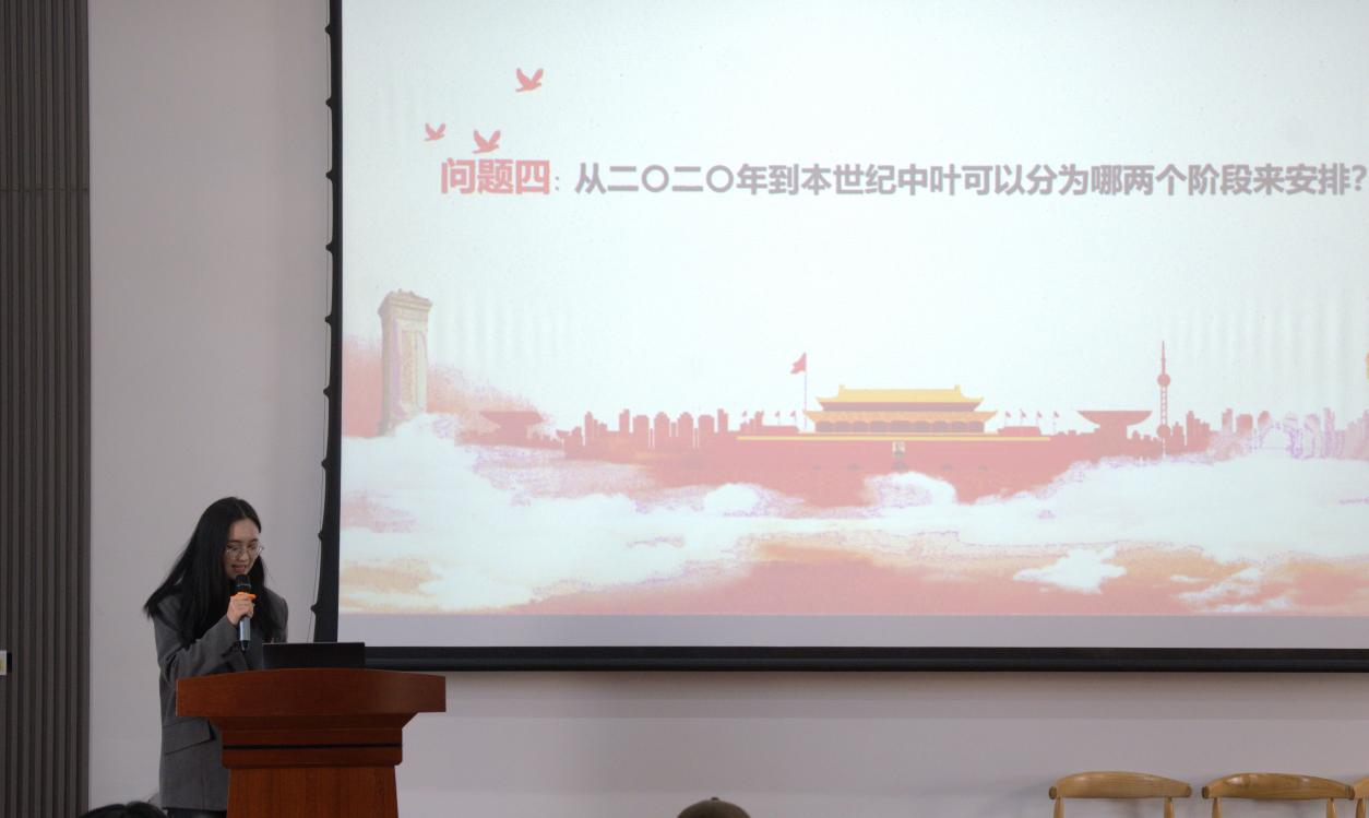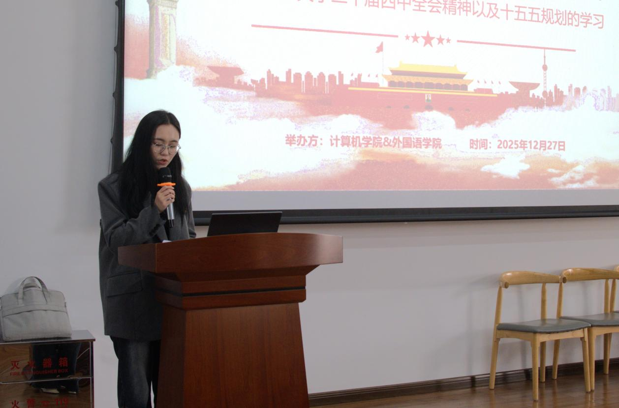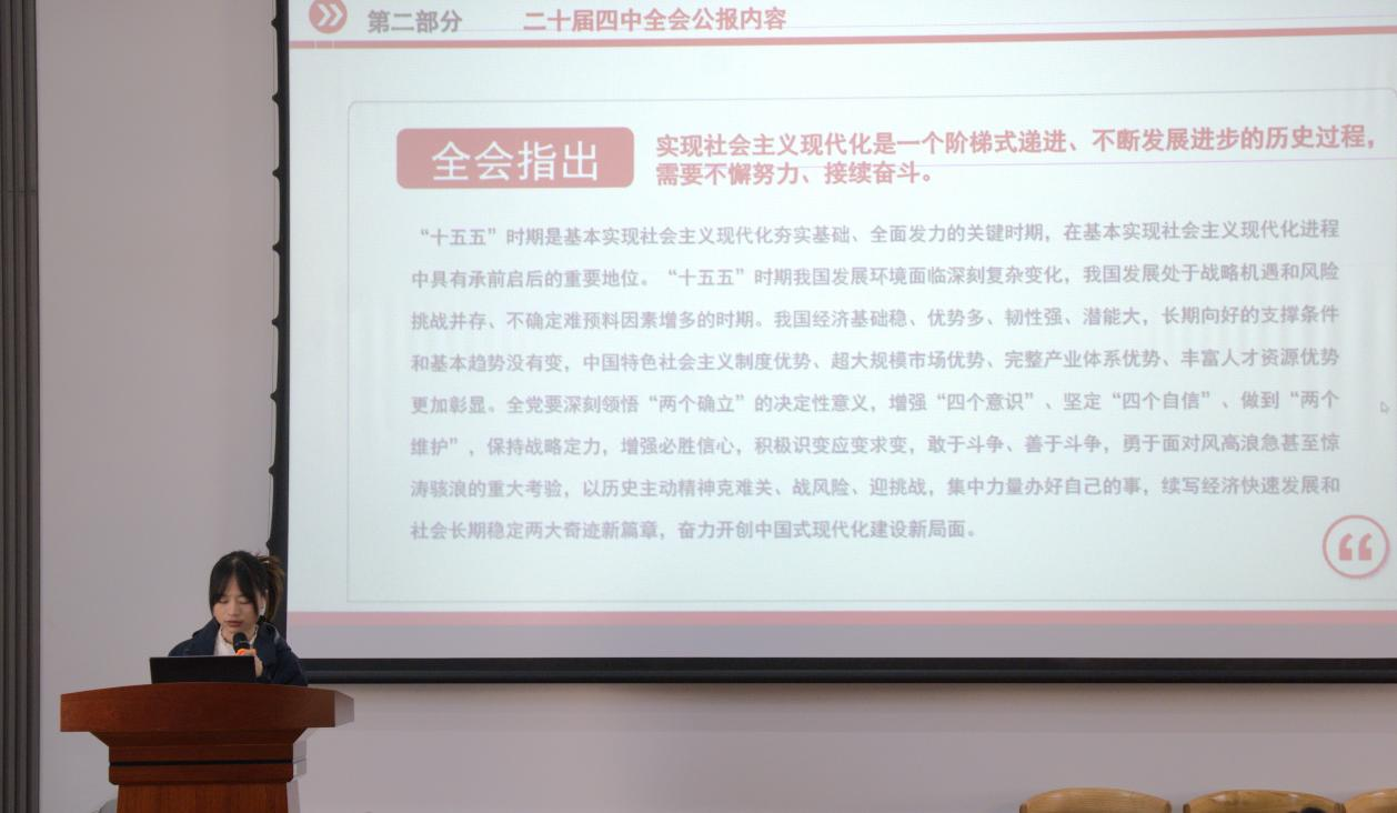 辅导员黄奕婍从二十届四中全会基本概况和全会公报核心内容两大板块展开讲解。条理清晰的目录梳理、结合时政的图文素材,让参会师生对全会召开的时代背景、重大意义有了系统性认识。黄奕婍围绕全会提出的新思想、新论断、新部署,结合计算机、外国语学科的专业特点,剖析了青年学子在科技强国、国际交流等领域的责任与使命,让抽象的理论知识变得具体可感。