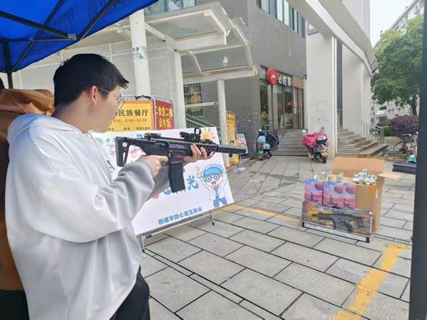 体验营中设有四个互动区域,每个都巧妙地将心理关怀融入轻松的活动里。“情绪沙包投掷”让同学们把压力装进沙包,随着一次次投掷和阵阵笑声,同学们的心情也跟着舒畅起来;“手链DIY”让大家在专注串珠的过程中放松心情,体验亲手完成一件小物的踏实与满足;“美食小店”里,同学们一起动手制作水果杯,分享酸甜滋味,简单而快乐;最后的“负能量狙击站”准备了水弹枪,参与者击落代表烦恼的卡片,并在旁边的寄语墙上写下鼓励的话语,完成了一次从释放情绪到传递温暖的过程。